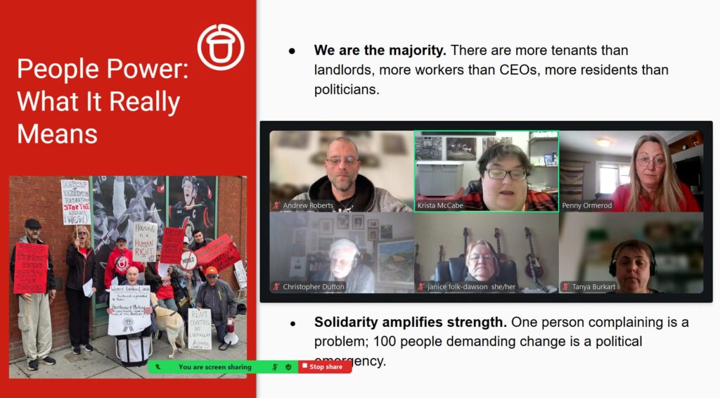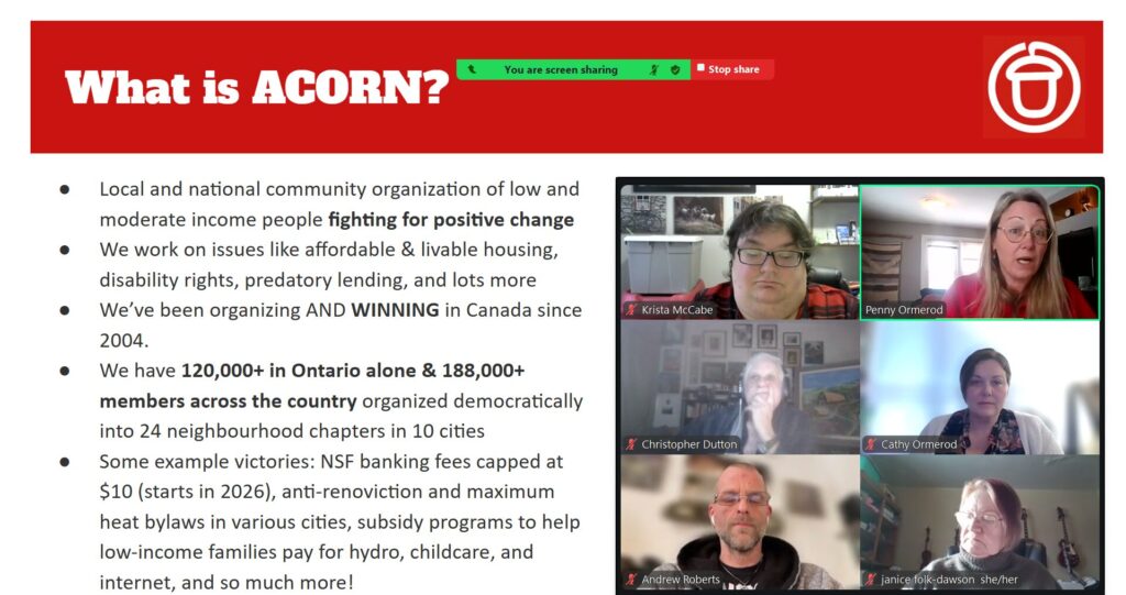 On Saturday, ACORN hosted an online ACORN 101 workshop, bringing together 28 participants from Ontario cities without ACORN offices to learn more about the organization, its mission, and how members can get involved in building people power.