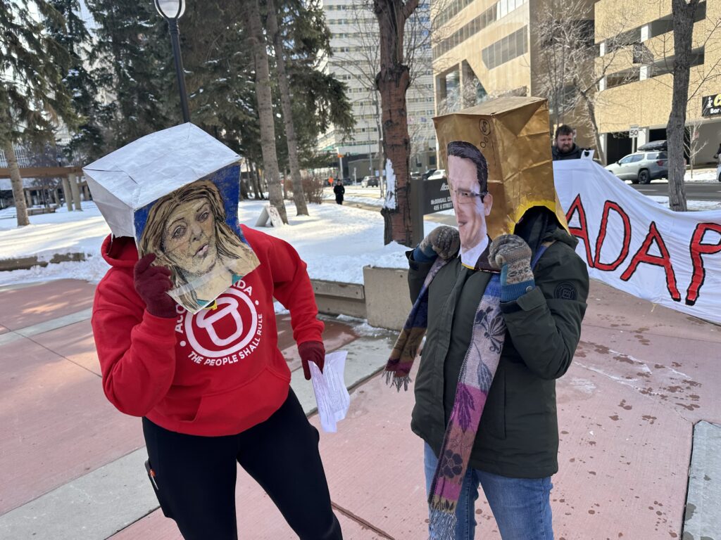 The event went really well, and the members seemed to have a lot of fun! A member, Myrl, made some props out of paper bags with photos of Jason Nixon, the Minister of Assisted Living and Social Services (i.e., the one in charge of rolling out ADAP), and Premier of Alberta Danielle Smith on them. Members had a lot of fun making fools of the premier and the minister, saying the truth about the government’s true goals to force people with disabilities into poverty. We started in the main square, out front of McDougall Centre, then moved to the sidewalk so cars and people walking could see everyone more easily. Many people honked in support from their vehicles.