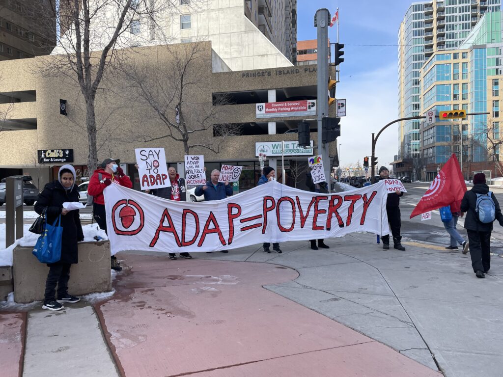 CBC sent a reporter, who interviewed three of our members, including Jesse, who spoke to the press for the first time and did a fantastic job calling on all Albertans to unite and fight back against ADAP. The reporter also filmed us holding our signs and chanting. Members shared personal stories about their struggles on AISH and how this new program will hurt them even more.