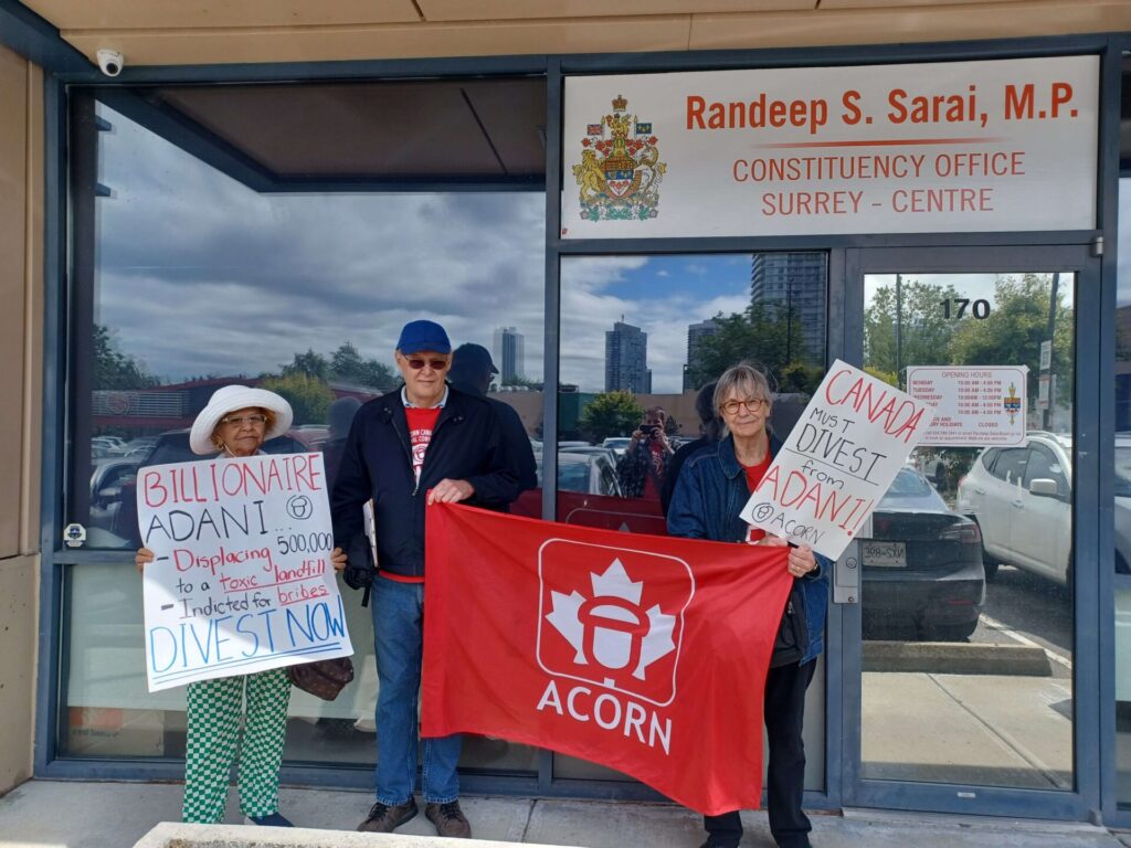 A small but determined group of ACORN members marched from Surrey Central Station to MP Randeep Sarai’s constituency office to demand that Canada divest from the Adani Group. MP Sarai is the Secretary of State for International Development, making him a prime target for the demand for Crown Corporations like Export Development Canada (EDC) to divest from Adani. Members entered the office and delivered a demand letter to staff, calling for action on Adani’s forced evictions in Dharavi and raising concerns about Canadian financial ties to the conglomerate.