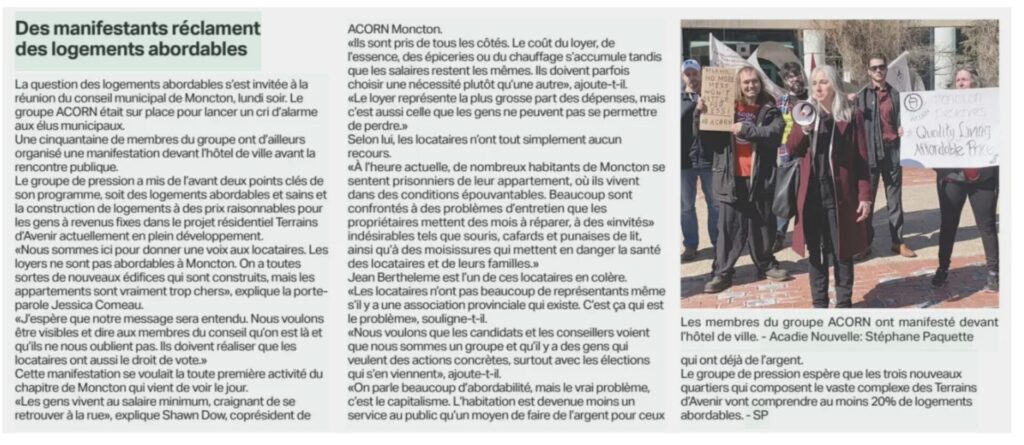 NB ACORN members and supporters came out in droves in front of and IN City Hall to launch our Healthy Affordable Homes campaign! Members protested outside the building to DEMAND the city council force landlords to provide safe and clean living arrangements. And inside, Moncton ACORN leaders spoke with city council to make sure the apartments in the new Vision Lands project be affordable for people in core housing need. People running for city council endorsed our platform and want to fight for tenants rights in Moncton! The current councilors got to hear our members give a voice to the voiceless and demand affordable housing for all.