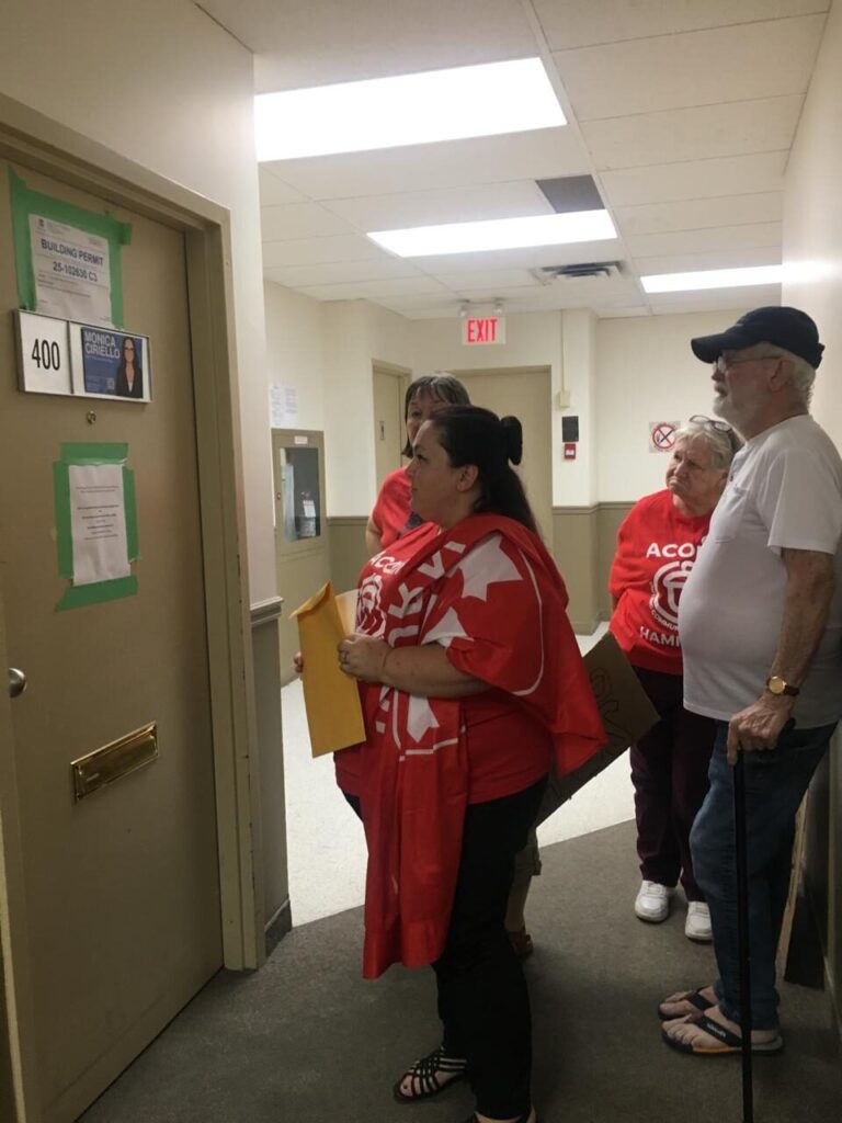 On Wednesday, July 23rd, leaders from Hamilton ACORN’s Mountain chapter visited the new constituency office of MPP Monica Ciriello at 1030 Upper James St. to deliver a copy of ACORN’s provincial platform for tenant justice and a letter requesting a meeting.