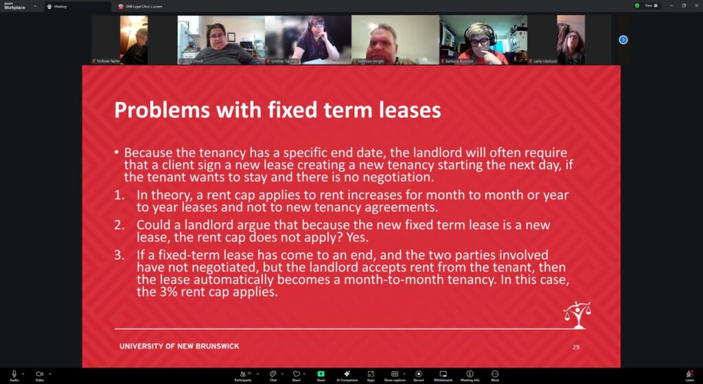 La présentation de la clinique juridique de l’UNB a exploré différents scénarios, mettant en évidence les responsabilités des locataires, des propriétaires et des gouvernements, ainsi que les droits des locataires dans la province et les mesures qu’ils peuvent prendre pour se protéger.