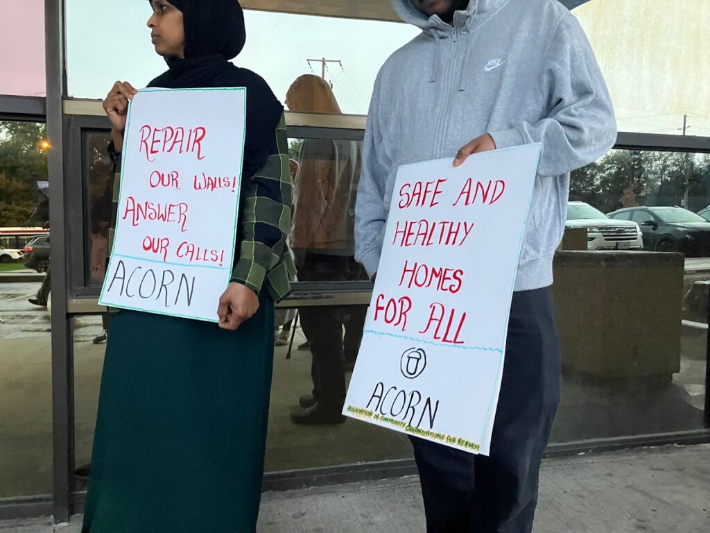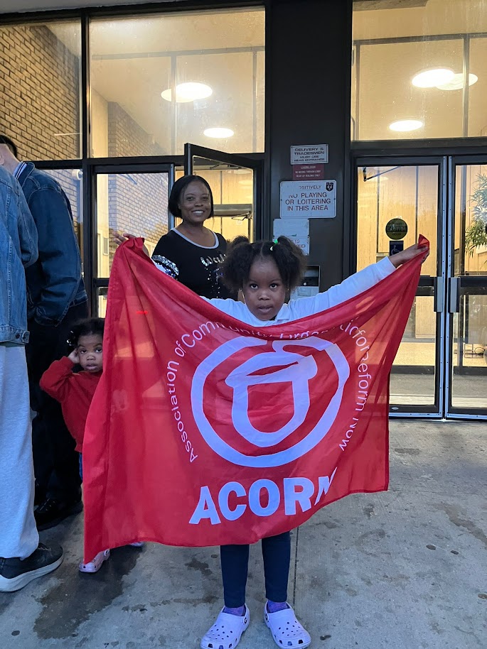 Sharon Mitchell, a promising new leader and returning ACORN member led the rally, heartfelt and forceful, livestreaming on her socials while tenants of the building shared their stories. The crowd came up with chants on the fly, and Sharon gracefully welcomed the property manager into the crowd when he came out of hiding to attempt to snuff out the rally.