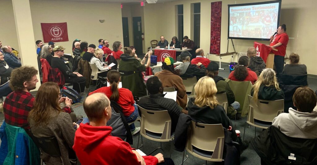On October 30th, 55 ACORN members hosted the City of Ottawa staff who are drafting the renoviction by-law for a public consultation. ACORN leaders Sara Laviolette and Mel Battison went over the epidemic of renovictions and the tactics landlords use. City staff gave a presentation on their plans to develop a renoviction by-law and then listened to 15+ ACORN members with renoviction experience and lawyer Claire Michela from Raven Law!
