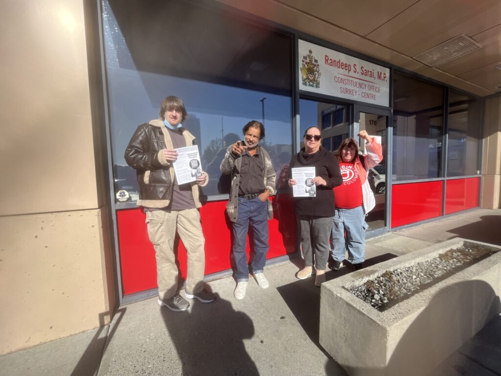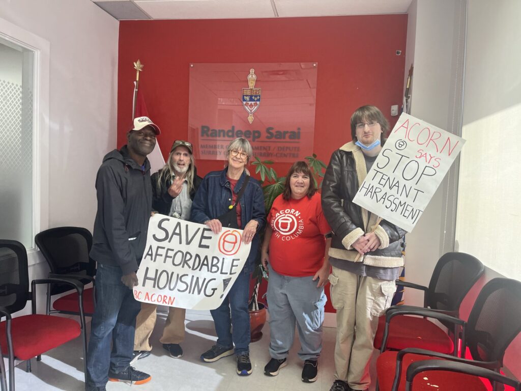 In Surrey, highlighting the need to protect affordable housing, ACORN started our action by doing outreach outside Regency Apartments, where 500+ families are still at risk of being demovicted from their homes and displaced from the neighbourhood. We then marched to the constituency office of Surrey Central Liberal MP and Secretary of State for International Development, Randeep Sarai. It’s crucial that any Federal money for housing going to BC comes with strings attached: anti-displacement protections to protect thousands of renters from looming demovictions in areas around transit hubs. Although MP Sarai wasn’t in his office, we secured commitments from staff to schedule a meeting with Surrey ACORN leaders soon.