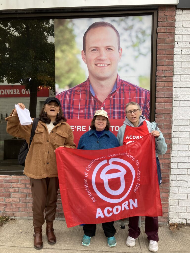 The location emphasized the need to protect existing affordable housing while we try to build our way out of the housing crisis as we lose 15 – 30 affordable housing units for every one unit of affordable housing built. ACORN members chanted we need to tie in better tenant protections, like vacancy control, to stop incentivizing landlords to push out long term tenants. We also need non-market and deeply affordable housing to really tackle this crisis. Thanks to members Becky Desrochers and Dominic L’Heureux for leading this action.