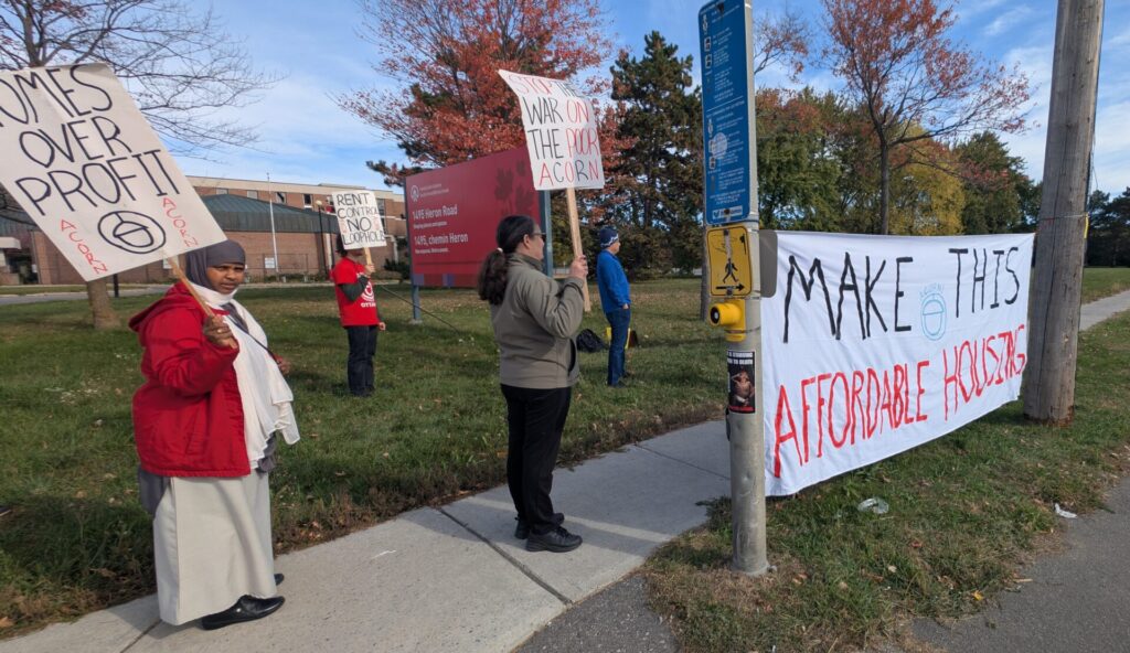In the national capital we went down to 1495 heron rd, a new proposed site for Build Canada Homes. The neighbourhood has a rich history of organizing with ACORN for housing, the lot across the street used to house 500 families that were demovicted for luxury apartments by Hazelview.