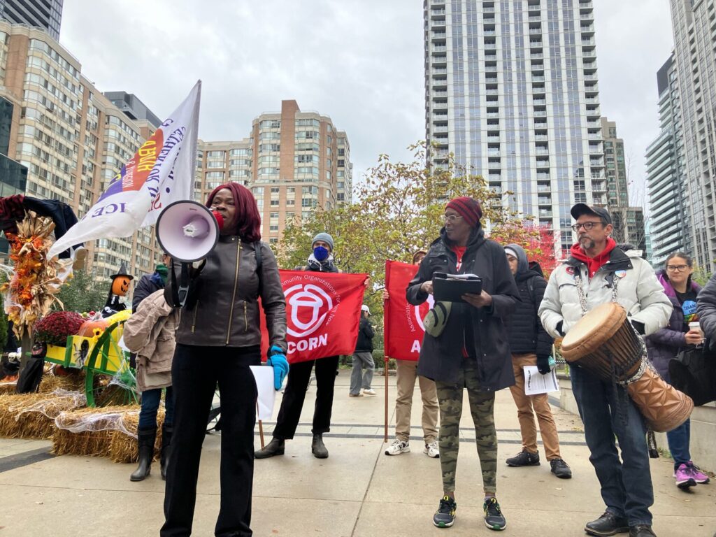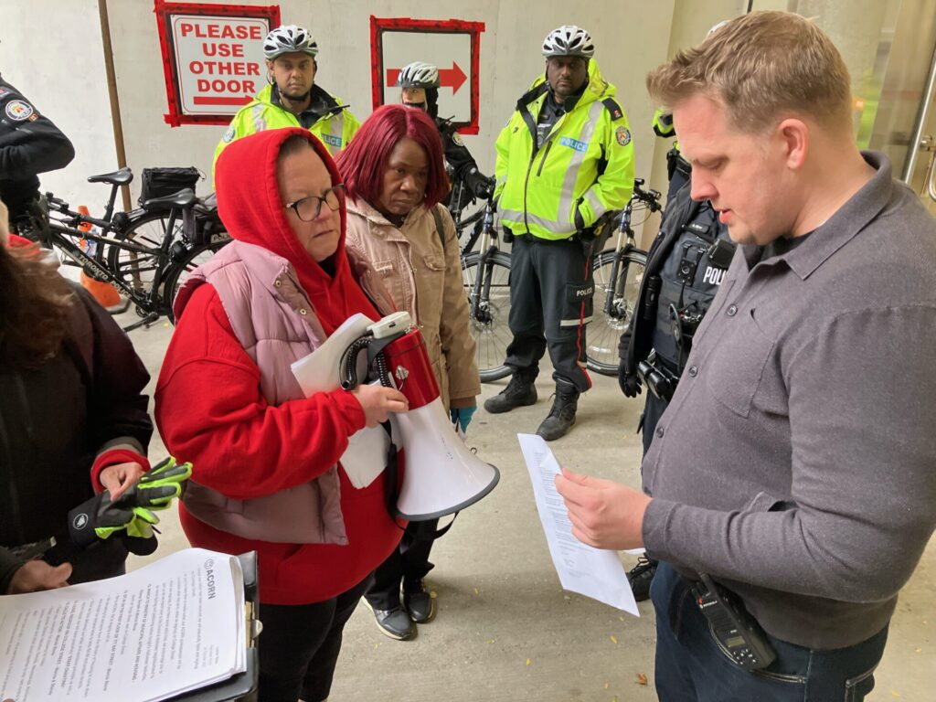 35 ACORN members rallied in College Park with allies from the York South-Weston Tenant Union, FMTA and Toronto & York Region Labour Council. Members then led a march to the Ministry of Housing, where private security blocked the doors. ACORN leaders negotiated delivery of a demand letter to the 14th floor then moved on to the Ministry of the Attorney General where we took over the lobby. Leaders, Stacey Semple and Marcia Stone, successfully delivered the demand letter after some creative persistence. The People United Will Never Be Defeated!